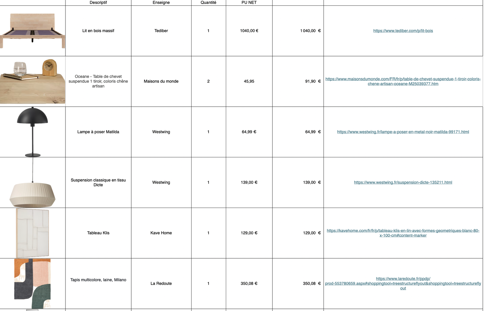 - Shopping list détaillée pour faciliter vos achats de mobilier